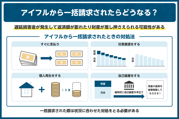 アイフルから一括請求されたとき、無視や誤った対応をすると法的措置に発展するおそれもあります。事態を悪化させないためにどのような対応をするべきなのでしょうか。ここでは、一括請求への具体的な対処法をわかりやすく解説します。
